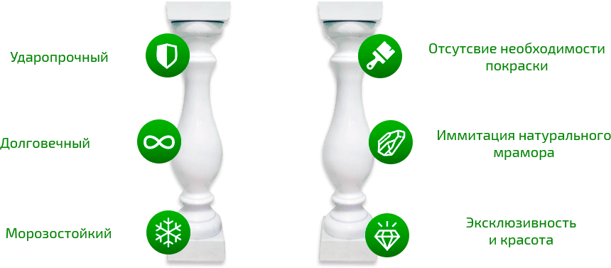 Мрамор-бетон – искусственный камень из бетона, в основе которого применяется белый цемент. По своим свойствам не уступает, а во многом и превосходит натуральный мрамор. Материал имитирует форму и структуру природного мрамора. Благодаря возможности добавления в процессе производства широкую палитру расцветок, можно получить балюстрады различных оттенков.